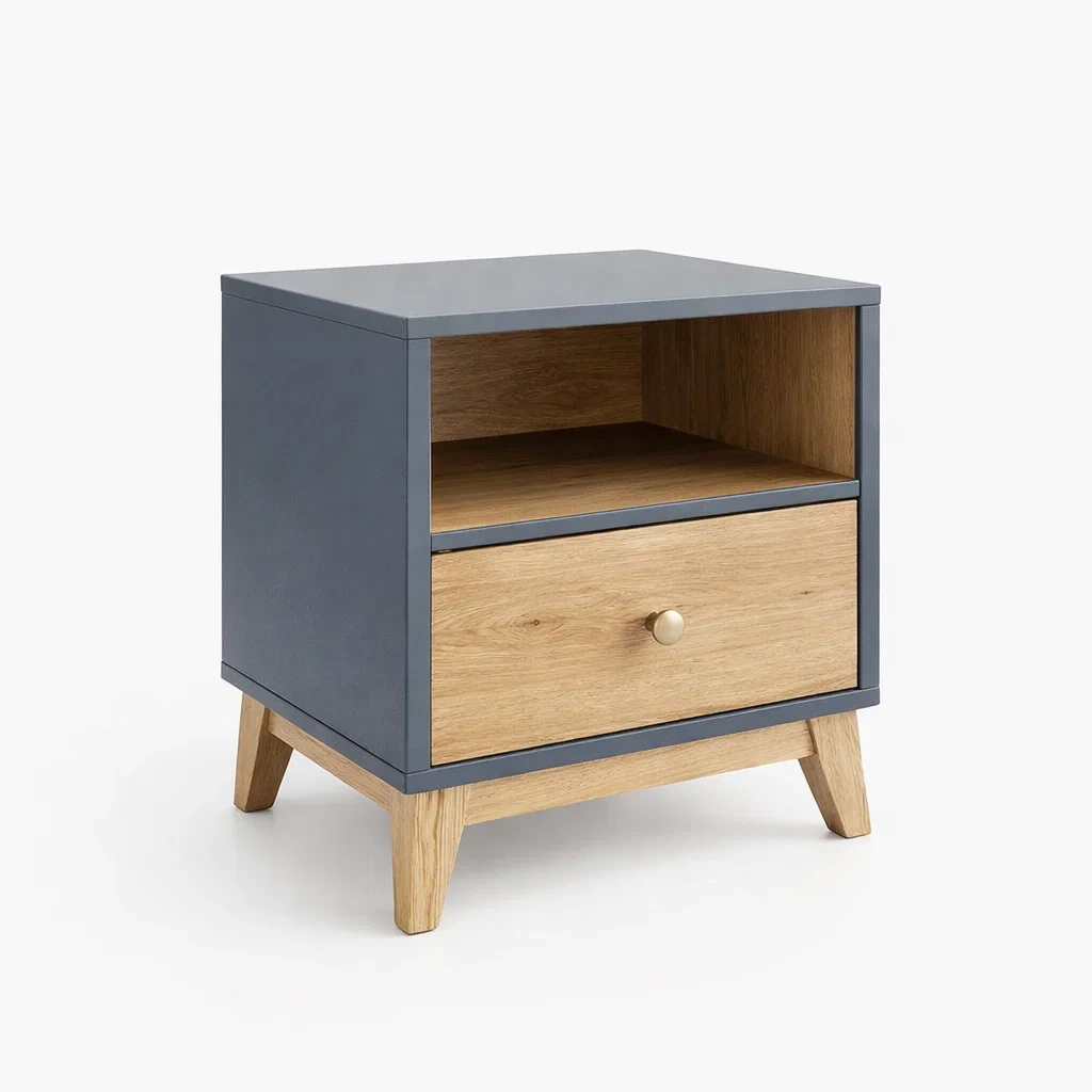 Table de chevet en bois avec cadre bleu et tiroir en chêne